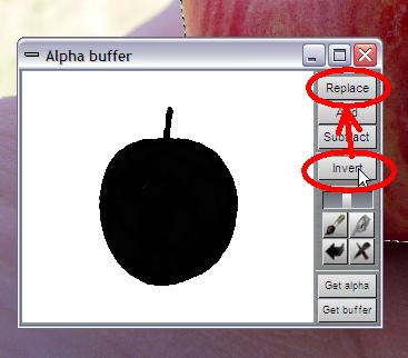 Click on 'Invert' inside the stored alpha image, and click 'Replace' to