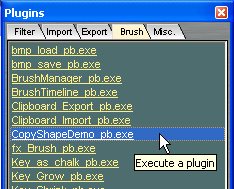 Launching the Program The program can be started before Dogwaffle, but when it's time to send your creation to Dogwaffle as a brush (by clicking "New Brush" in the Dogwaffle group), it will try to connect to Dogwaffle and if it fails it will remind you that you should first start Dogwaffle. The filename was changed from the original to include "_pb.exe" at the end. This makes it eligible to be recognized by Dogwaffle as a Brush-related plugin, and thus it will appear in the list of brush plugins. Hit 'k' to see the list of killer plugins. Then select the Brush tab. Or select the tab directly through the brush menu: menu: Brush > Brush plugin... |