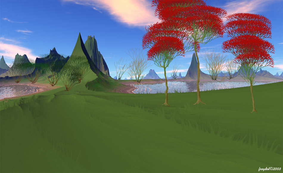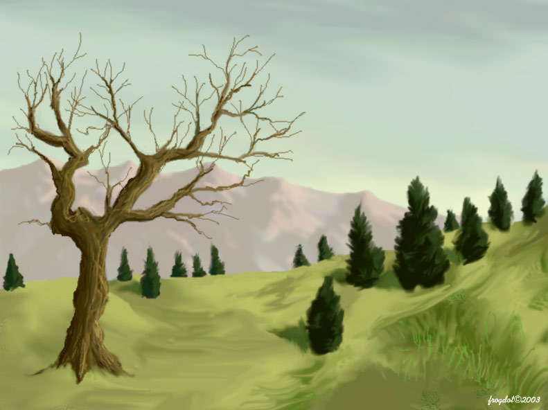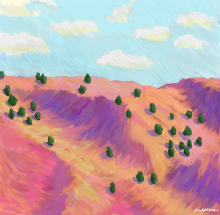 mostly digital art.I also use 3D tools like Bryce, Poser, Amapi, Mojoworld. My PC is a Dell, 2.4ghz with XP home What I like most about Project Dogwaffle is the closeness to "real" painting and drawing. About my artwork: 'Fiddler'- I used to draw frogs and had a line of pen & ink drawings/paintings for sale, years ago. Tried recreating one here. 'Pastel Hills'- most like a painting style I had. Painted over a Bryce rendering. I really like to experiment with Dogwaffle. It is difficult to relax and let a brush fly around with other programs I've used during years of precise digital art. Dogwaffle allows the freedom of freeform painting, without the turpentine smell :-) My website is www.phazedance.com - I also have artwork at 3dcommune |