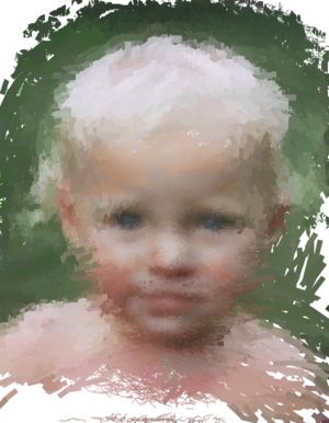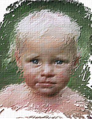 Back in Project Dogwaffle. If you want more details in the eyes and mouth area, or simply want to blend a portion of the original photo into the Gertrudis version, copy the original image into the Swap buffer and use the Rubthrough mode for the brush to selectively bring bits and pieces of the original photo into the modified version. Here we have the original eyes and mouth blended nicely into the modified picture. |