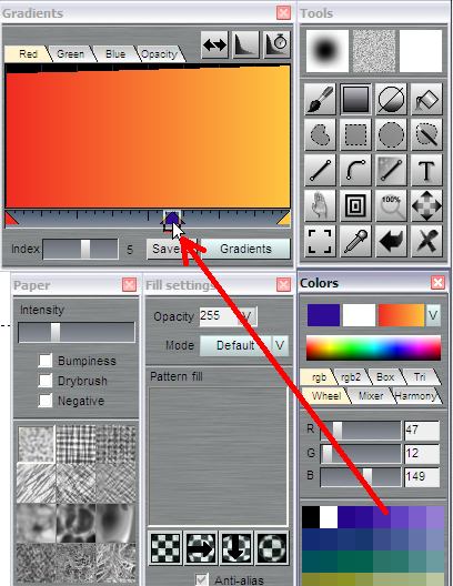 drop one such color from the color well over to the gradient panel: