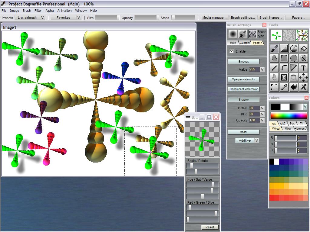 Using thecolor and transform controls from the brush manager, you can