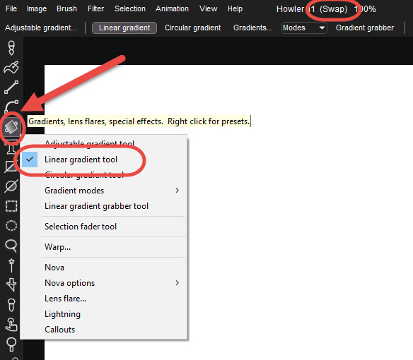 While still looking at the Swap image, load a linear gradient into it: Select the Linear gradient tool from the Gradients tool (below the Curve tool)