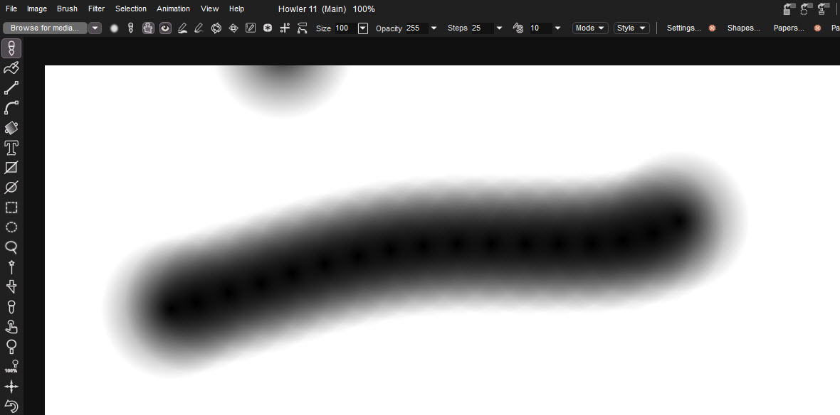 Now draw a similar brush stroke from left to right, and observe how the size of the brush evolves, based on the linear gradient that's hidden underneath in the Swap image.
