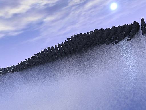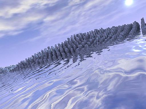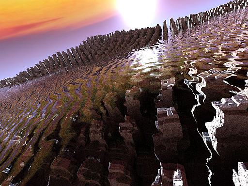The water plane can also be transparent, which makes it refractive too. Now you can again see the landscape that is submerged. It is however distorted by the waves in the refrection through the water plane: