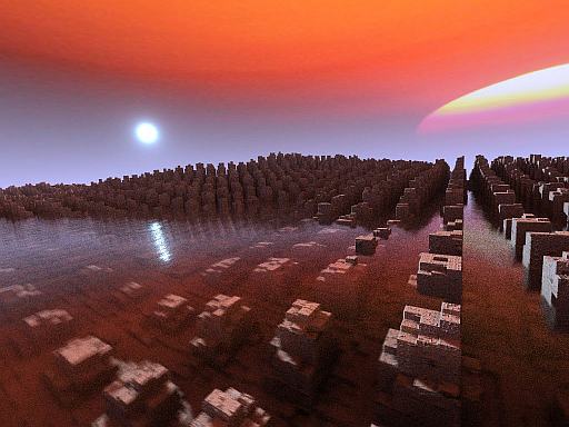 This one appears to have two suns. The small blue star to the left of this binary star system is the visible sun that reflects on the water and provides most of the directional lighting and cast shadows. The big red giant to the right is part of the sky dome image. Still, it contributes its brightness and tinting to the scene's global illumination, and also appears reflecting in the water.