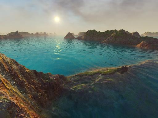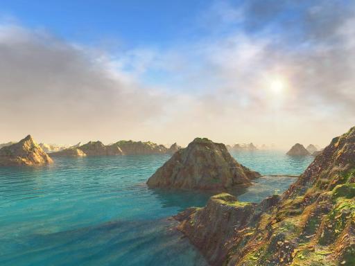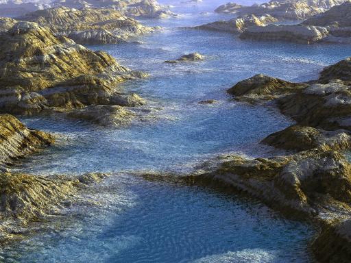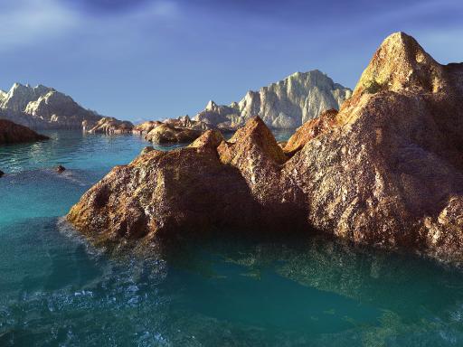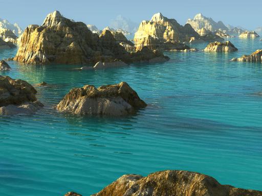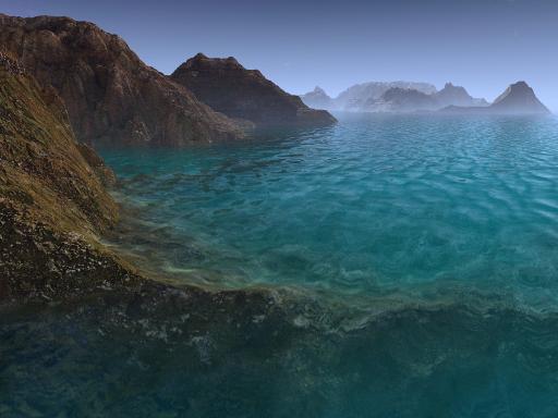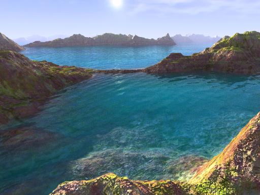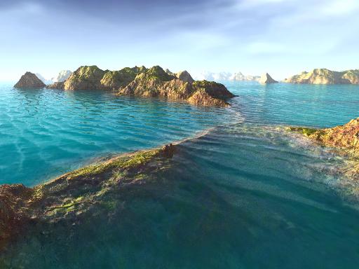 Puppy Ray uses real Fresnel calculation to determine what to show when looking at water: the scenery below, essentially the ocean floor, as it appears refracted through the water's wavely deformations, or the world above, reflected on the water surface, such as the sky above, and the nearby islands, mountains, beaches.