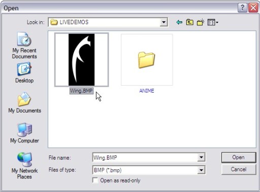 Find, select and open the image file, in this case Wing.BMP: